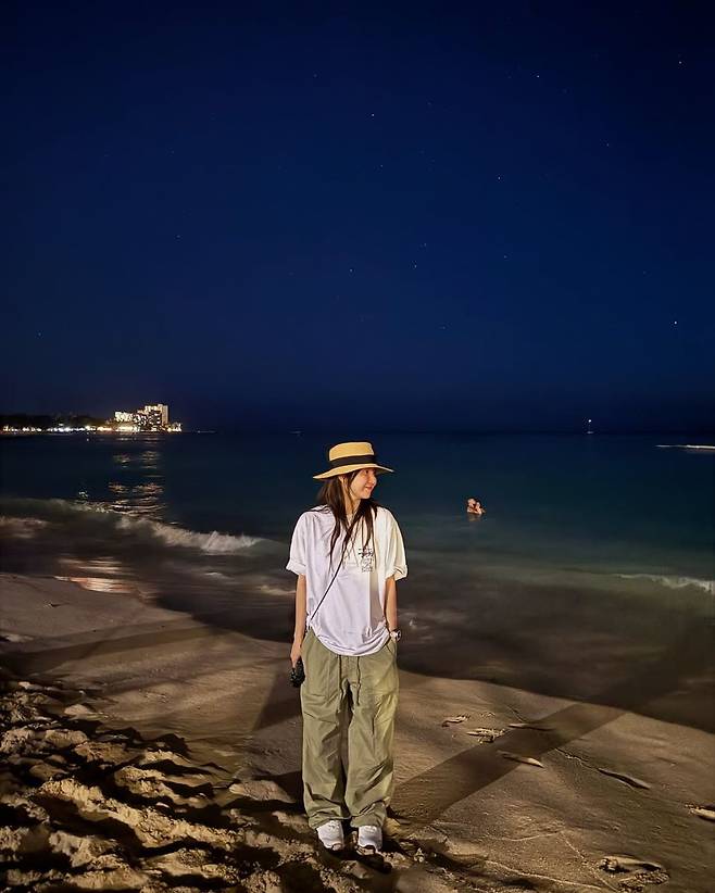 스트로 햇과 카고 팬츠의 조합은 단순하면서도 여행지에서 빛을 발하는 조합이다. 특히 밝은 톤의 티셔츠와 톤온톤으로 어우러지는 팬츠는 빛이 적은 밤바다에서도 그녀의 실루엣을 돋보이게 했다. 실제로 조명이 닿는 부분과 그렇지 않은 부분의 대비 속에서도 착장이 무너지지 않고 오히려 자연스러움을 더하며, 하와이의 자유로운 분위기를 잘 담아냈다.