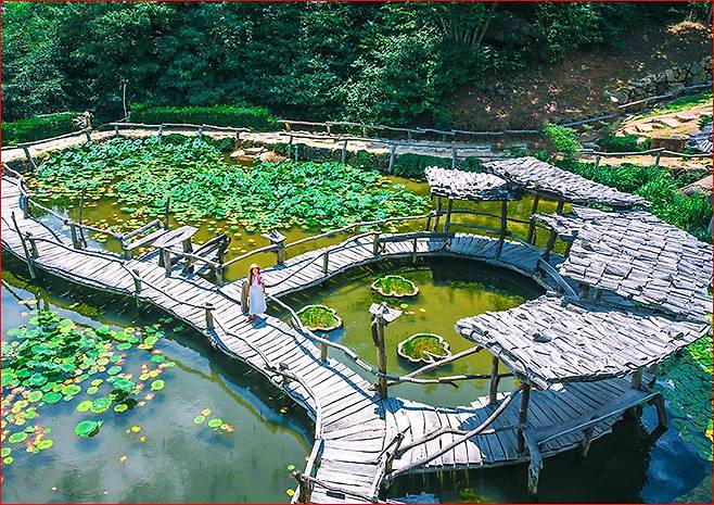 입구의 소나무 숲길과 여여문, 그리고 시야를 압도하는 연못과 목조 다리는 수선사의 상징 같은 풍경입니다. 구부러진 나뭇가지를 그대로 엮은 듯한 투박한 다리와 난간은 전통과 자연스러움이 어우러진 멋을 보여줍니다.