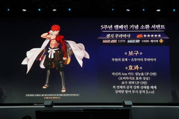 5주년 기념 신규 서번트가 나온다. 페이트 스테이 나이트의 남주인공인 에미야 시로가 원본인 '센지 무라마사'가 바로 그 주인공이다. 이종혁 사업부장은 "센진 무라마사는 원래 23년 1월 1일 업데이트 되야 할 서번트지만 5주년을 맞이하여 빠르게 가져왔다"고 소개했다.