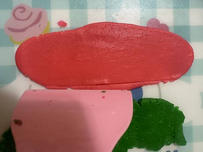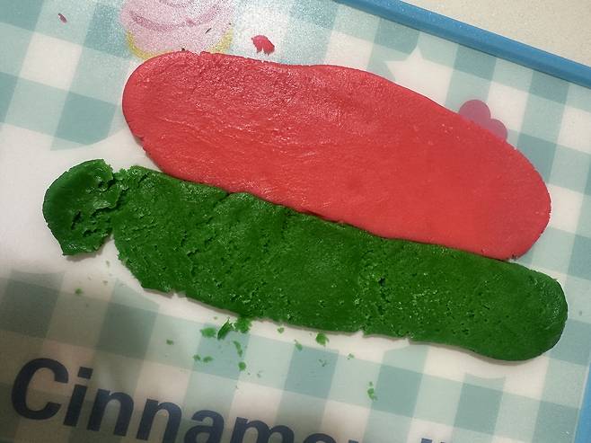 먼저 빨간색 쿠키반죽을 밀대로 밀어주세요.