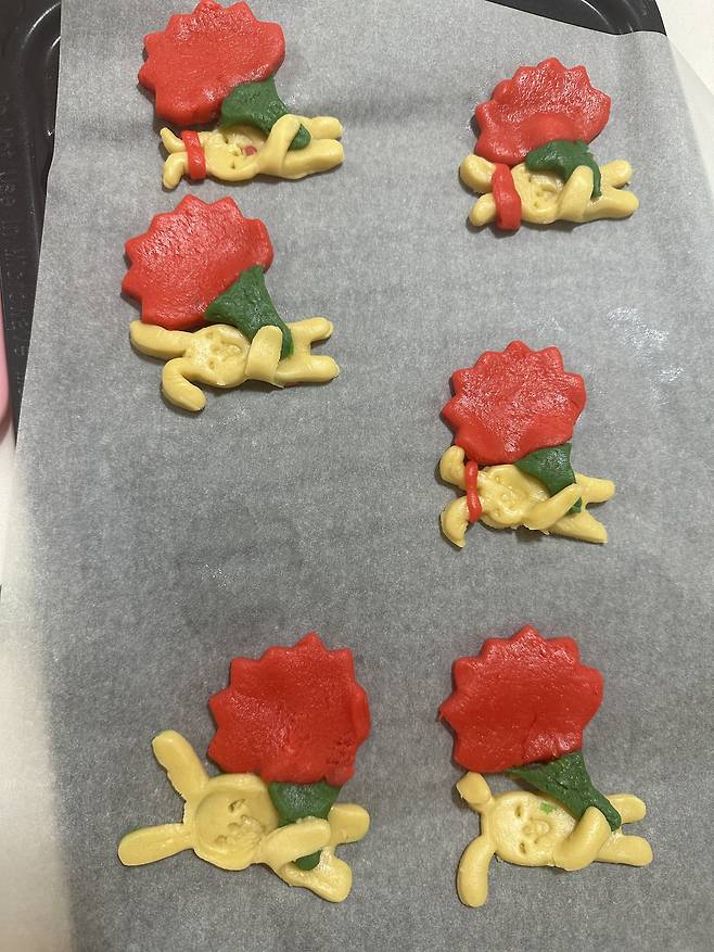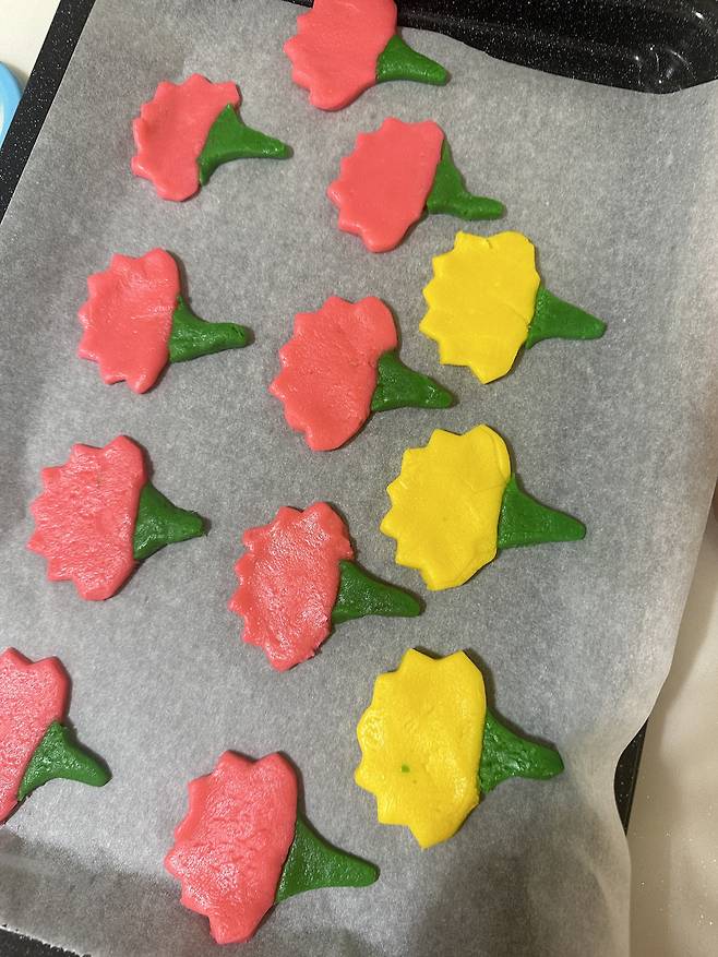 빨간 부분과 초록 부분에 카네이션 모양틀을 잘 맞춰 찍어주세요. 모양틀이 없으실 경우 빵칼로 자유롭게 모양을 만들어 잘라내셔도 좋을 것 같아요.