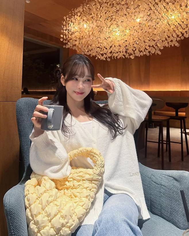 스타일링 또한 헤어와 잘 어우러지는 따뜻하고 부드러운 톤으로 연출되었다. 그녀는 오버핏 아이보리 니트에 연청 데님을 매치해 캐주얼하면서도 따뜻한 느낌을 주었다. 니트의 폭닥한 질감과 여유 있는 핏은 카페라는 공간의 편안함과 잘 어우러지며, 실내에서도 세련된 무드를 자아냈다. 여기에 시선을 끈 것은 바로 그녀의 노란빛이 감도는 뽀글뽀글한 소재의 쇼퍼백이다. 폭신한 텍스처와 컬러감이 착장 전체에 포인트를 더하며 발랄한 분위기를 배가시켰다.