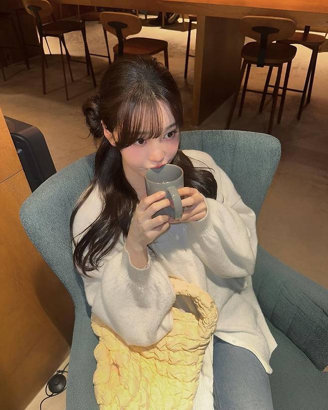 따뜻한 음료 한 잔과 함께한 그녀의 여유로운 순간은 겨울과 봄 사이, 간절기 시즌에 참고할 만한 데일리 스타일링으로 제안할 수 있다. 편안함과 사랑스러움을 모두 잡은 이번 룩은 실내 카페나 데이트룩, 혹은 집 앞 나들이룩으로도 손색없는 완벽한 밸런스를 보여준다.