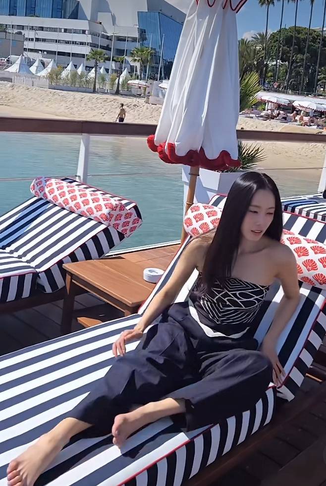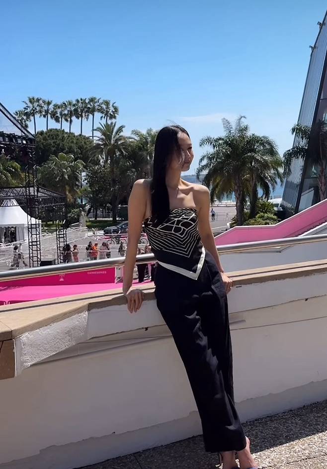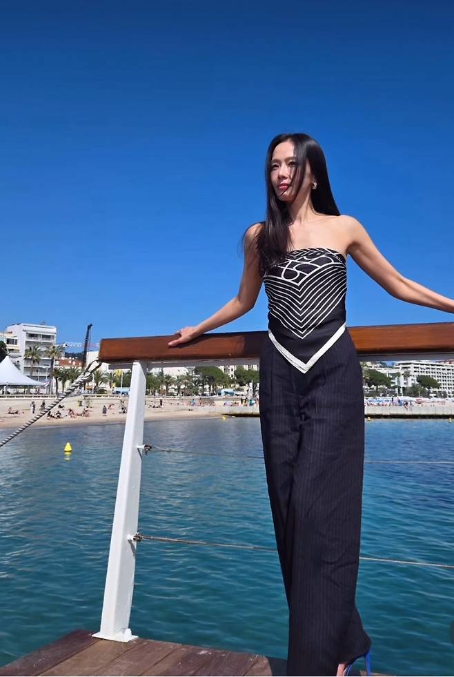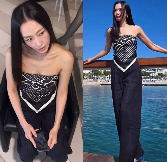 홍수현은 독특한 실루엣의 스트랩리스 탑과 핀스트라이프 팬츠를 매치해 도회적인 무드를 완성했습니다.