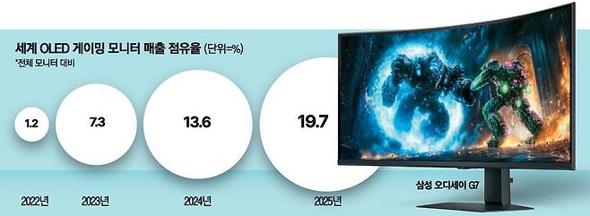 특히 OLED 게이밍 모니터는 지금까지 주류를 이뤘던 LCD 모니터를 제치고 '새로운 대세'로 자리 잡을 것이라는 기대를 받는다. 실제로 2022년 글로벌 전체 모니터 시장에서 1.2%에 그쳤던 OLED 모니터 매출 점유율은 2023년 7.3%, 2024년 13.6%를 거쳐 지난해 20%까지 확대됐다.