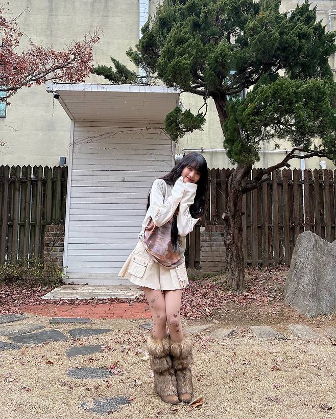 가수 민니가 베이지 톤의 니트와 미니스커트로 따뜻한 가을 감성을 연출하고 있다. 크림색 터틀넥 니트는 소매를 살짝 걷어 올려 자연스러운 무드를 표현했으며, 같은 톤의 카고 미니스커트와 매치해 통일감 있는 룩을 완성했다. 특히 퍼 소재의 롱부츠는 겨울철 포인트 아이템으로 활용되어 전체적으로 포근하면서도 세련된 스타일링을 연출하고 있다.