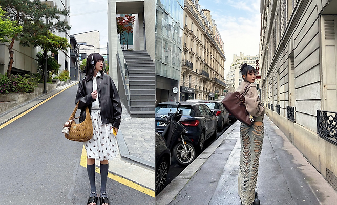 파리 거리를 배경으로 한 이 룩에서는 베이지 후드티와 디스트로이드 진으로 캐주얼 시크를 연출하고 있다. 특히 찢어진 디테일이 돋보이는 플레어 진은 독특한 실루엣으로 시선을 사로잡으며, 브라운 백팩과의 컬러 매치가 세련된 감각을 보여준다. 파리의 클래식한 건축물과 어우러져 유럽풍 스트리트 패션을 완벽하게 소화하고 있다.