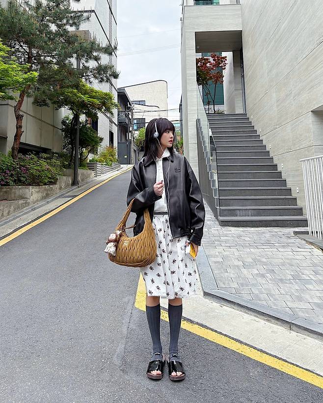 검은색 오버사이즈 재킷과 화이트 플로럴 원피스의 조합으로 청춘스러운 매력을 연출하고 있다. 니하이삭스와 로퍼를 매치한 스쿨룩 스타일링은 클래식하면서도 트렌디한 감각을 보여준다. 프린지 디테일의 브라운 토트백이 전체 룩에 포인트를 더하며, 헤드폰 액세서리로 일상적이면서도 스타일리시한 분위기를 완성하고 있다.