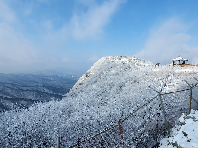 해발 1,193m의 비로봉 정상은 하늘정원 입구에서 출발해 30분도 채 걸리지 않습니다. 정상부는 오래 머물 공간이 많지 않지만, 바로 아래 데크 전망대에서 충분히 휴식을 취할 수 있습니다. 겨울 특유의 맑은 공기 덕분에 대구, 군위, 영천 일대가 한눈에 들어오는 시원한 조망이 펼쳐집니다.