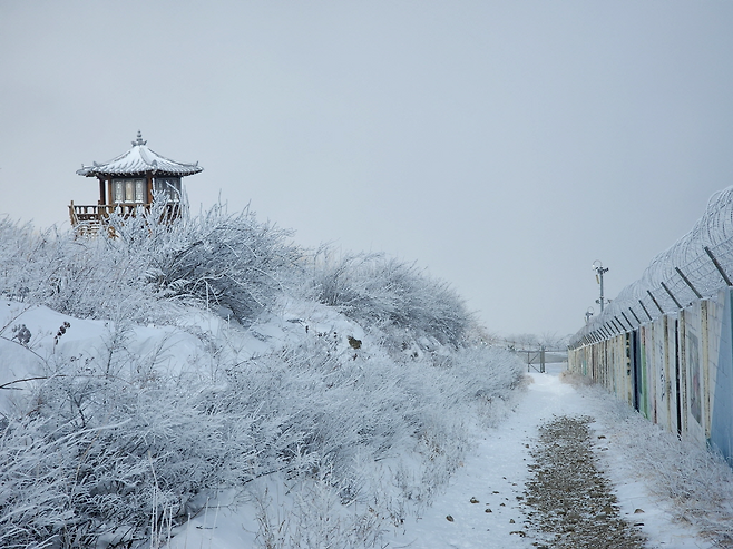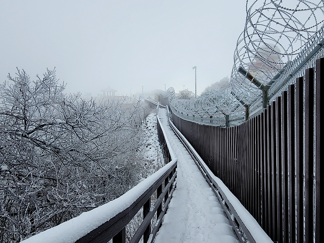 하늘정원을 지나면 군사시설 외벽을 따라 임도 형태의 산길이 이어집니다. 전반적으로 경사가 완만하고 노면 상태가 좋아 겨울 산행임에도 부담이 크지 않습니다. 실제로 이 코스는 대부분이 계단과 임도로 구성돼 있어 초보자나 가벼운 산행을 원하는 분들께 적합합니다.