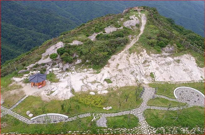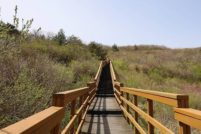 등산로 초입부터 데크 계단이 길게 이어집니다. 계단을 오를수록 뒤쪽으로 펼쳐지는 풍경이 계속해서 시선을 붙잡아, 짧은 코스임에도 자주 멈춰 서게 됩니다. 약 10분 남짓 오르면 하늘정원에 도착하며, 이 구간만으로도 충분한 만족감을 줍니다.