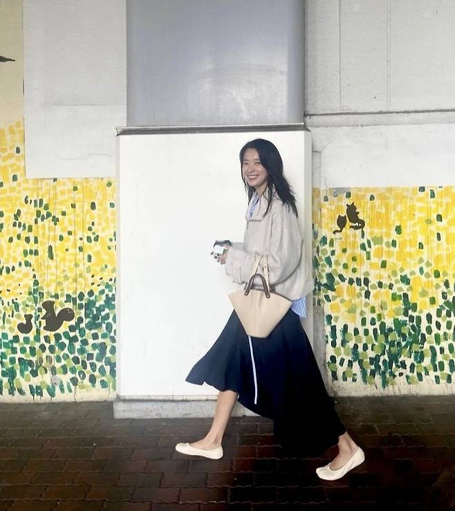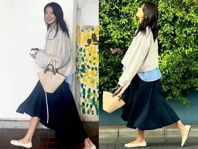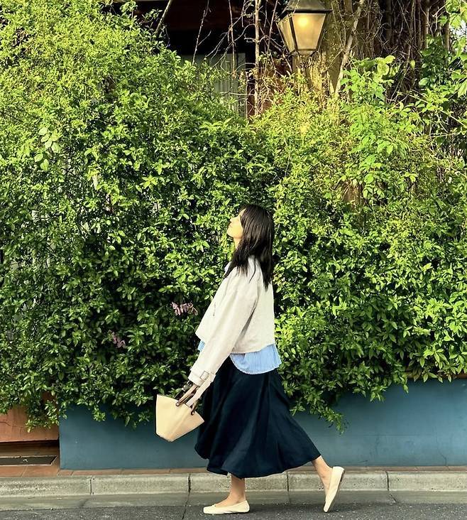 여기에 크림 컬러 플랫슈즈와 베이지 토트백을 더해 자연스럽고 편안한 무드를 연출했으며, 헝클어진 듯 자연스러운 웨이브 헤어와 해맑은 미소로 봄날의 자유로움을 가득 담았습니다.