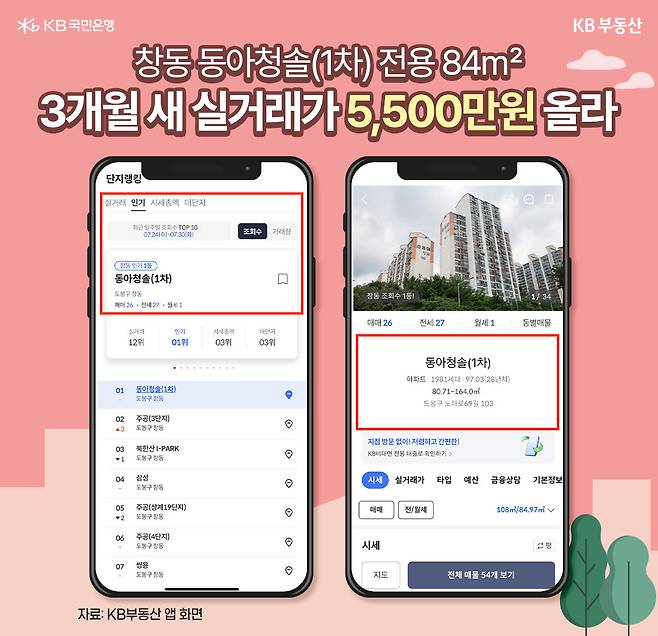 KB부동산 앱 단지 랭킹에 따르면, 7월 마지막 주 창동에서 조회수가 가장 많은 단지는 동아청솔(1차)입니다. 서울아레나와 바로 접해있는 동아청솔(1차)는 1997년 입주한 1,981가구 대단지로, 창동역에서 걸어서 5분, 단지 바로 옆에는 자운초와 자운고가 있습니다. 전용 84㎡가 4월 21층이 8억9,000만원에 거래됐는데요. 3개월 뒤인 7월에는 같은 층이 9억4,500만원에 거래됐습니다.