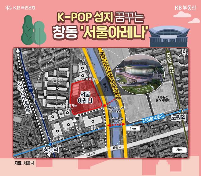 K-POP 전문공연장이 서울 동북권에 들어섭니다. 지난 7월 2일, 서울시와 카카오가 ‘서울아레나’ 착공식을 가졌는데요. 서울아레나가 들어서는 서울 도봉구 창동은 광역급행철도인 GTX-C노선, 동부간선도로 지하화 등 교통 호재도 많은 곳입니다. KB부동산이 서울아레나 진행 상황과 창동 집값 움직임을 살펴봤습니다.