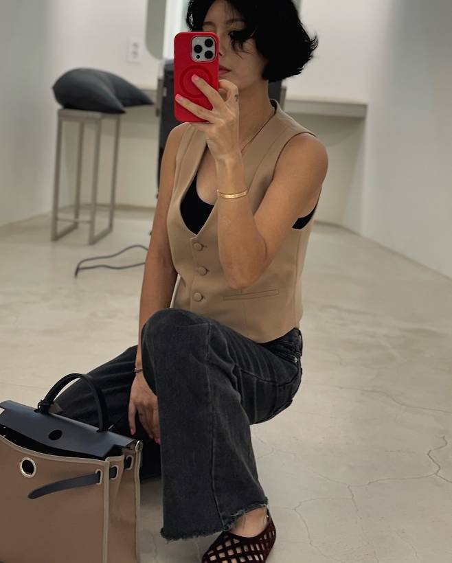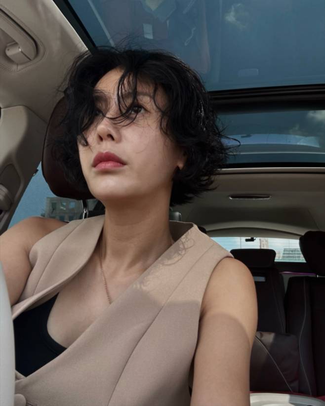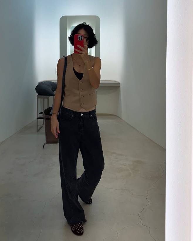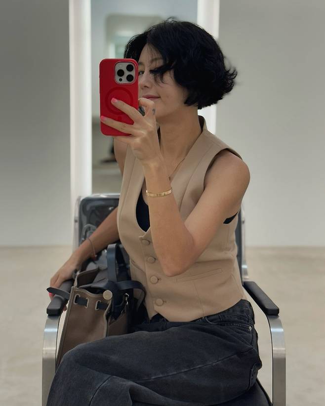 짧게 잘린 헤어와 미소는 단정한 인상을 주고, 베이지 톤의 버튼 베스트에 블랙 슬리브리스를 매치해 군더더기 없는 룩을 완성했어요.