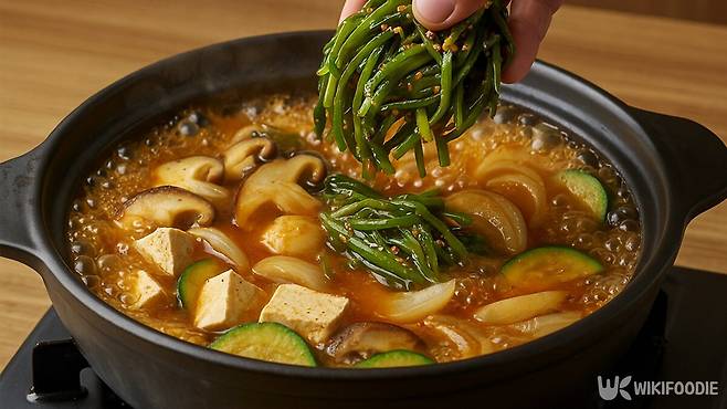 냄비에 물 1리터를 붓고 다시마 등 육수를 내기 위한 재료를 넣어 끓인다. 약 10분 뒤 다시마를 건져내면 기본 육수가 완성된다. 여기에 된장에 무친 고구마순을 넣고 양파, 버섯, 애호박을 함께 넣어 끓인다. 끓기 시작하면 불을 중약불로 줄인다.