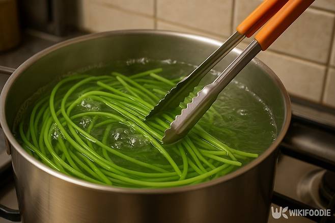 껍질을 벗긴 뒤에는 다시 끓는 물에 소금 1스푼을 넣고 5분 정도 삶아준다. 이때 뚜껑을 덮으면 색이 검게 변하므로 열어둔 채 삶는 것이 좋다. 삶아낸 고구마순은 찬물에 헹군 후 냉장 보관을 하면 3일 정도 신선하게 유지된다. 이 과정을 거치면 질기지 않고 부드럽게 조리할 수 있다.