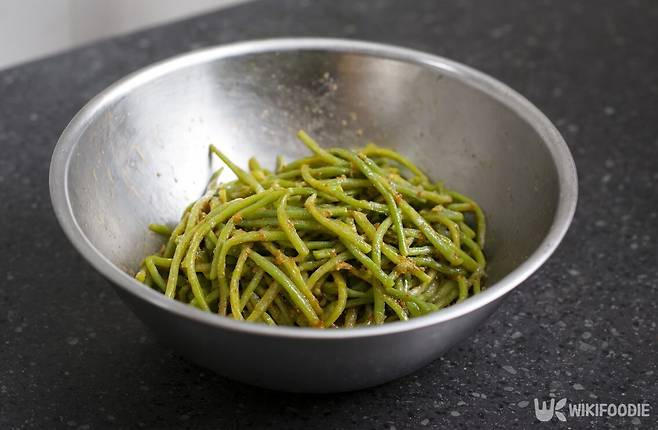 2. 삶은 고구마순 400g을 물기 빼고 된장 2큰술에 버무려 10분 둔다.
