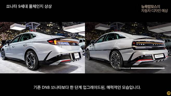한편, 쏘나타의 풀체인지 모델인 DN9에 대한 기대도 높아지고 있습니다. 뉴욕맘모스를 비롯한 렌더링 채널을 통해 공개된 신형 쏘나타의 예상 디자인은 ‘아트 오브 스틸’ 철학을 반영한 정제되고 견고한 모습입니다. 수평형 테일램프와 SONAT 레터링, 순차 점등 방식의 턴 시그널은 프리미엄 차량을 연상케 하며, 공기역학적 요소를 고려한 범퍼와 디퓨저 설계도 눈길을 끕니다.