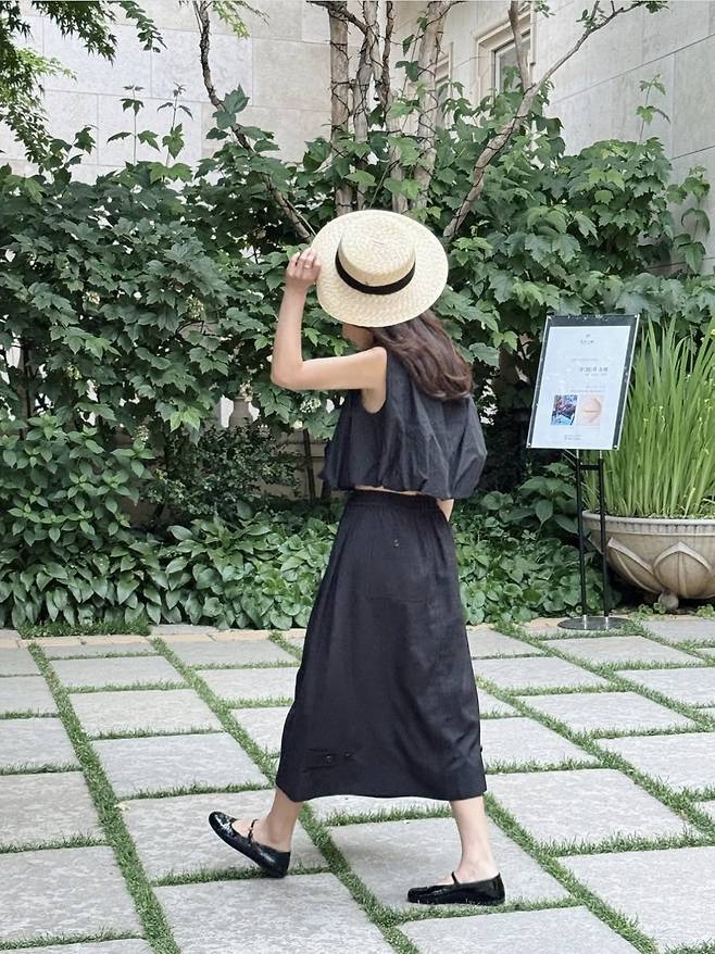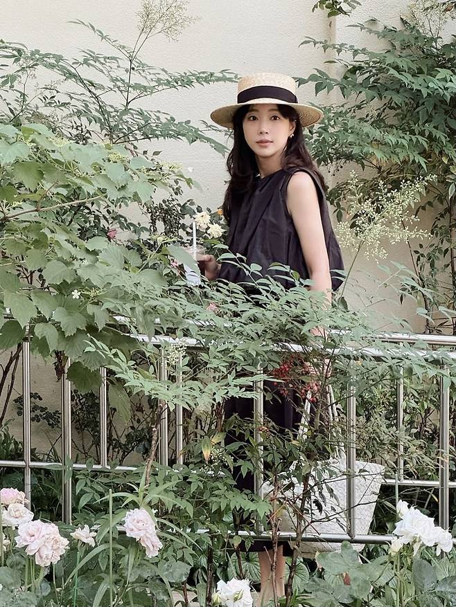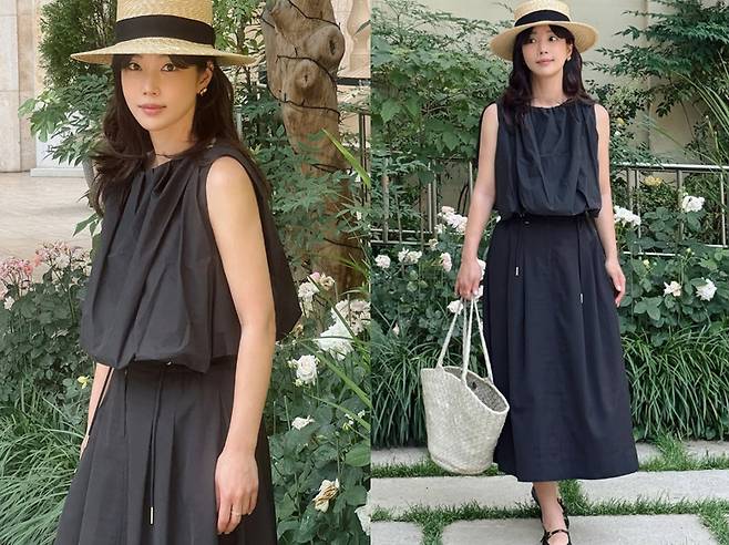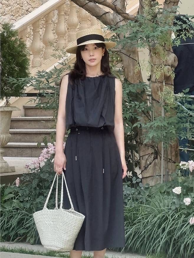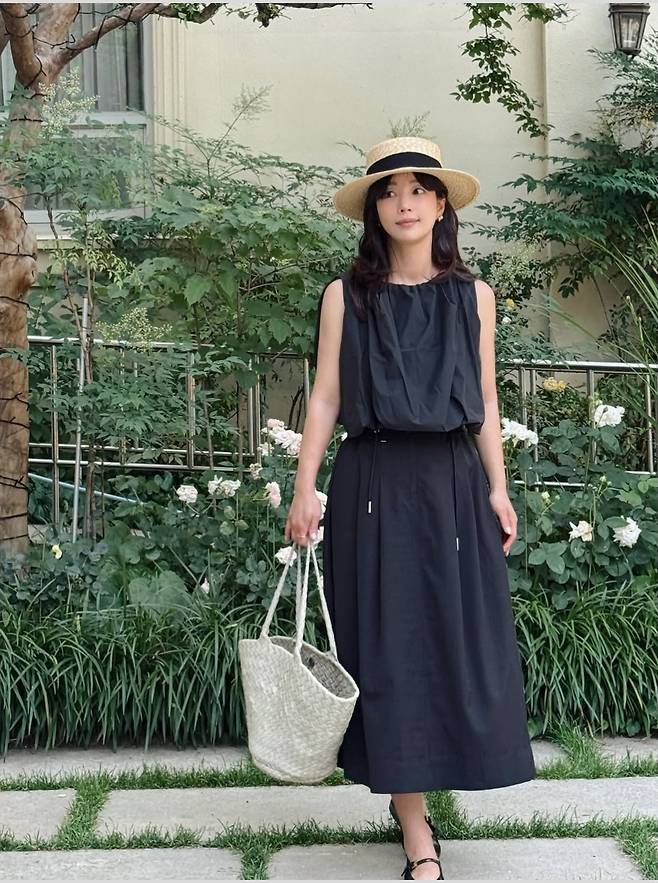 기은세는 우아한 블랙 톤의 슬리브리스 원피스에 스트로 햇과 라탄 백을 매치해, 마치 프렌치 영화 속 한 장면처럼 감각적인 여름룩을 선보였습니다.