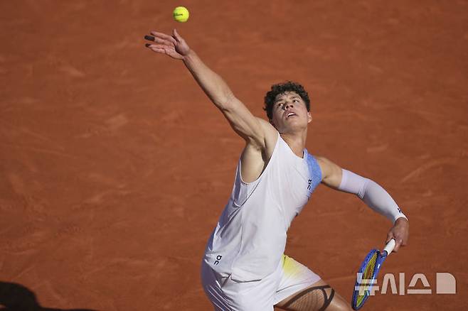 [파리=AP/뉴시스] 벤 셸턴(13위·미국)이 30일(현지 시간) 프랑스 파리 롤랑가로스에서 열린 프랑스오픈 남자 단식 3회전에서 마테오 지간테(167위·이탈리아)와 경기하고 있다. 셸턴이 3-0(6-3 6-3 6-4)으로 승리하고 16강에 올라 2연패를 노리는 카를로스 알카라스(2위·스페인)와 맞붙는다. 2025.05.31.