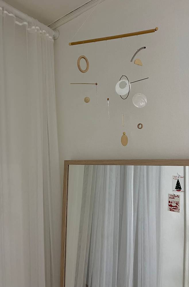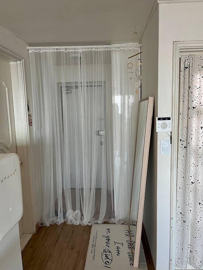 중문을 대체할 수 있는 기능으로 인테리어 효과까지 줄 수 있는 커튼을 설치하여 사생활도 보호하고, 우풍도 차단시키니 너무 좋더라구요. 현관 앞에는 전신 거울을 두어서 외출 전에 다시 한 번 용모를 점검할 수 있는 거셀 존을 만들었답니다 :)