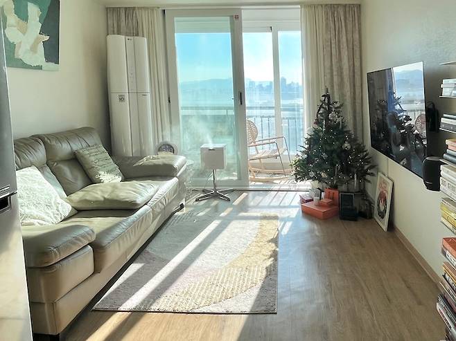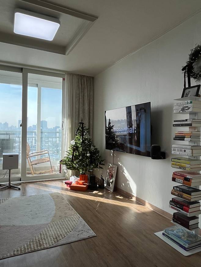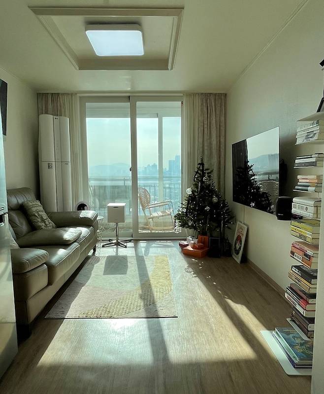 남향집이라 그런지 날씨가 맑은 날에는 아침부터 오후까지 햇빛이 잘 스며들어 가만히 앉아 햇빛만 쬐어도 힐링이 되는 듯한 거실 공간은 저희의 라이프 스타일을 그대로 보여주는 소파와 TV, 북 선반이 주된 인테리어 요소에요.