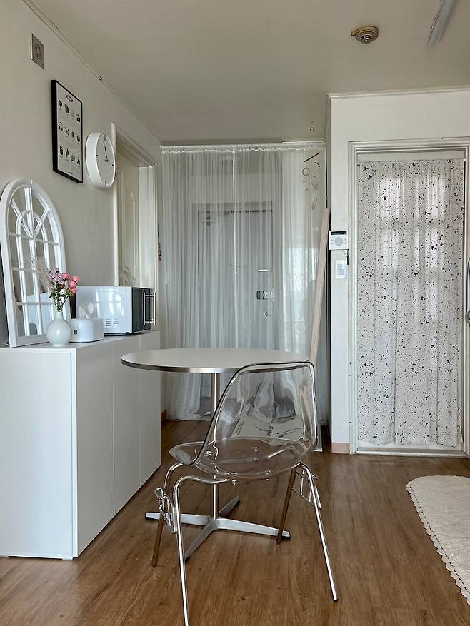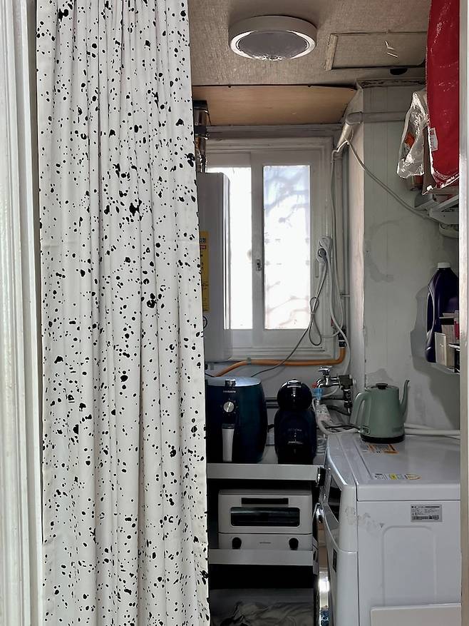 주방에 있는 세탁실 겸 탕비실은 낡은 문이 설치되어 있어 인테리어 효과를 줄 수 있는 커튼을 설치하여 보기 싫은 부분은 가리고, 전체적으로 차분하고 따뜻한 무드를 연출하였어요. 주방과 같은 곳은 수납과 동선의 효율성이 생명 인지라 탕비실 내부의 여유 공간을 활용해서 조리 관련 전자 제품을 비치 하였어요.