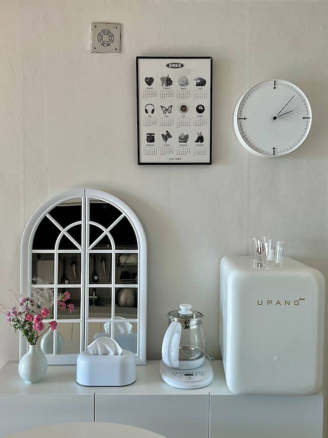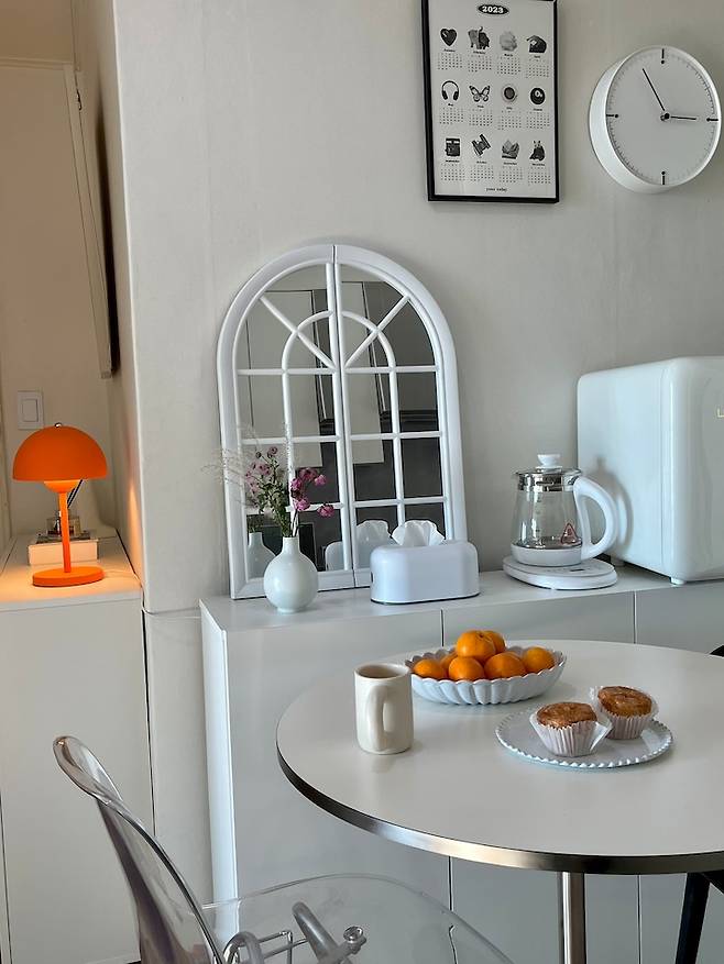 곧 태어날 아기를 위한 맘마존이에요. 주방 공간을 최대한 확보하기 위하여 슬림한 디자인의 수납장을 두고 그 위에 필요한 물건 수납과 함께 인테리어 오브제로서도 기능할 수 있는 소품을 함께 연출하여 미적인 무드도 놓치지 않으려고 했답니다. 다이닝 테이블에 둔 투명 의자 또한 공간을 더욱 개방감 있게 연출하고 싶어 구매했는데 좋은 선택 이였던 것 같아요 :)