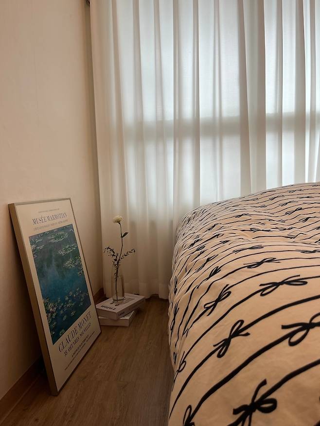 침실에 커다랗게 나 있는 창문과 낡은 샷시(새시)를 가리기 위해 하얀색 쉬폰 커튼을 맞춤으로 제작하였는데요. 숙면을 위해 암막 기능은 있지만, 아침에는 자연 빛이 조금이라도 투과될 수 있는 나비주름 쉬폰 커튼으로 낡은 창 샷시를 가려주고, 바람도 막아줘서 좋더라구요.