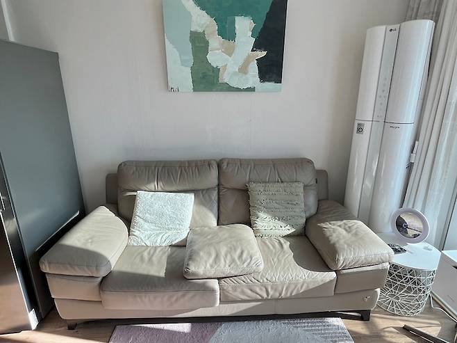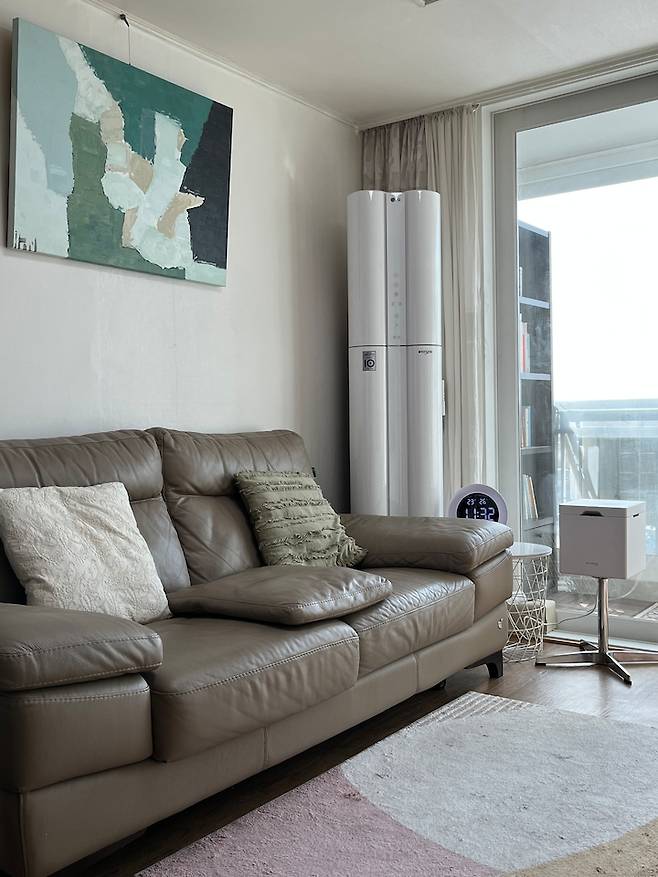 소파를 선택한 뒤에는 색감과 톤을 고려하여 전체적으로 라이트하고 내추럴한 무드의 러그와 액자를 선택하고 계절이나 기분에 따라 소파 쿠션 커버를 바꿔가면서 인테리어 재미를 주고 있어요.