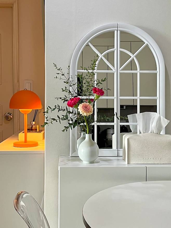 저희 집에서 가장 컬러풀한 공간이 될 것 같네요. 오렌지 계열의 무드를 중심으로 계절을 대표하는 플라워 연출로 밝고 화사한 느낌을 보여주고 싶었어요. 햇빛이 밝게 드는 날이면 자연광이 더욱 화사하게 비춰져서 음식 플레이팅 사진도 잘나와서 다이닝 공간으로 마음에 쏙 드는 공간이에요 :)