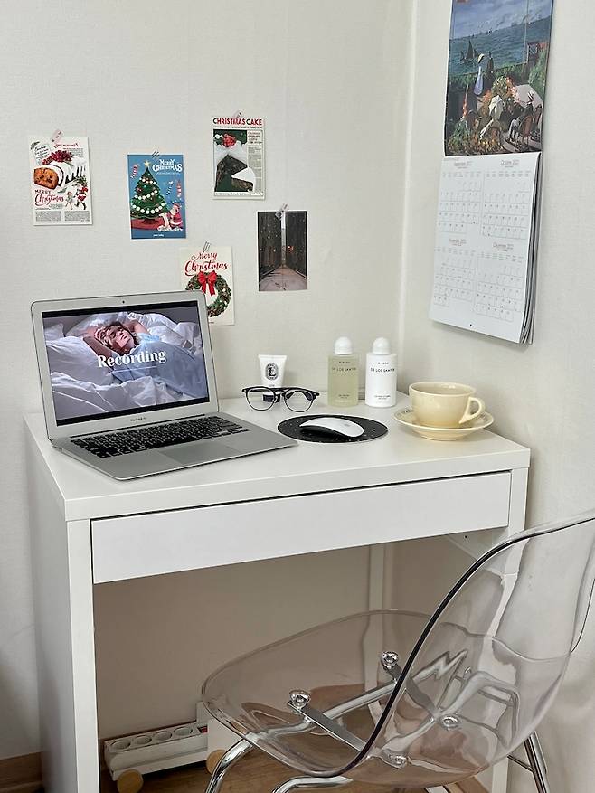 침대 바로 옆에는 컴퓨터 작업을 할 수 있는 1인용 테이블을 둬서 필요할 때마다 업무를 보고 있어요. 저희 부부의 은근한 자리 쟁탈전이 있는 이 책상에서는 면적 100cm도 안되는 작은 크기이지만, 의외로 할 수 있는 작업이 많아서 하루에 한 번 이상은 꼭 활용하게 되는 공간이에요. 하지만 아이가 태어나면 아마 아기 침대를 놓는 공간으로 바뀌게 될 것 같네요^^;;
