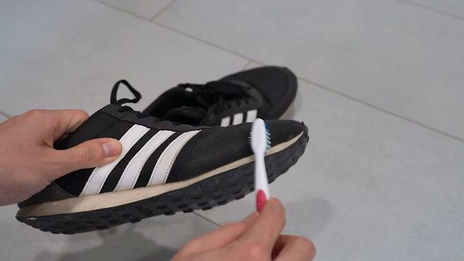 먼저 운동화 겉면에 있는 흙이나 먼지 등을 털어 주세요. 이때 칫솔 등을 이용해 겉면을 닦으면 쉽게 제거가 가능합니다.