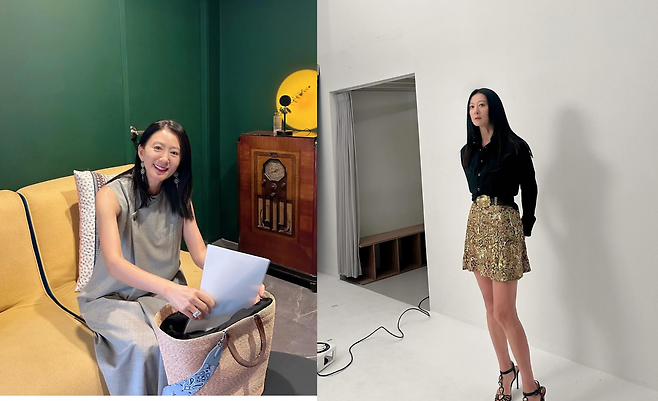 배우 김희애가 세련된 블랙 셔츠와 골드 패턴 미니스커트를 매치한 모던 시크 룩을 선보이고 있다. 클래식한 블랙 셔츠를 깔끔하게 착용하고 화려한 골드 패턴의 미니스커트로 포인트를 주어 세련된 대비를 연출하고 있다. 여기에 블랙 스트랩 힐을 매치해 다리 라인을 더욱 길어 보이게 하는 효과를 주었다. 특히 허리 부분의 골드 벨트 장식이 전체적인 룩에 고급스러움을 더하고 있다.