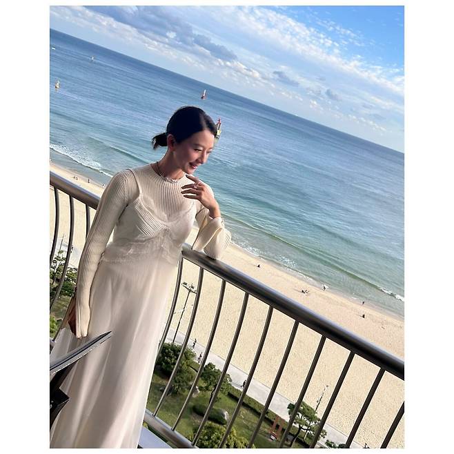 푸른 바다를 배경으로 김희애가 화이트 니트 드레스를 입고 여유로운 휴양지 패션을 선보이고 있다. 상체는 리브 디테일의 니트 소재로, 하체는 플로우 실루엣의 드레스로 이어지는 이 의상은 해변의 분위기와 완벽하게 어우러지고 있다. 소매 부분의 플레어 디자인이 우아함을 더하며, 화이트 컬러가 김희애의 맑고 깨끗한 이미지를 한층 부각시키고 있다. 자연스럽게 묶은 헤어스타일과 함께 여유로운 휴양지 패션의 정석을 보여주고 있다.