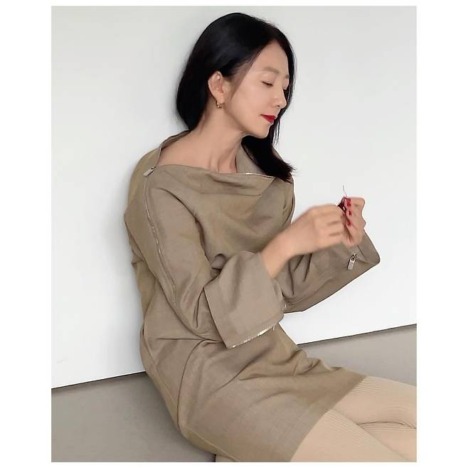 미니멀한 베이지 컬러의 오프숄더 원피스를 입은 김희애가 우아한 분위기를 연출하고 있다. 넉넉한 소매 디자인과 드레이프 디테일이 특징인 이 의상은 절제된 색감과 디자인으로 배우의 고급스러운 이미지를 한층 돋보이게 한다. 붉은 립 컬러로 포인트를 주어 세련된 분위기를 완성하고 있으며, 심플한 골드 이어링으로 전체적인 룩의 균형을 맞추고 있다.