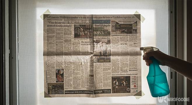 신문지에 식초 섞인 물이 흠뻑 스며든 상태에서 20~30분간 그대로 둔다. 시간 동안 방충망에 박힌 먼지들이 수분을 머금고 느슨해지면서, 신문지 표면에 흡착된다. 이후 신문지를 천천히 떼어내면 묵은 먼지가 신문지에 함께 붙어 떨어져 나온다. 별도의 걸레질 없이 1차 청소가 완료된다.