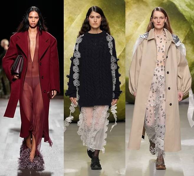 은은하고 투명한 시스루 드레스와 재킷 등 아우터를 매치한 관능적인 분위기의 테일러링 스타일 트렌드가 여전히 강세를 이어갈 것으로 보인다.
