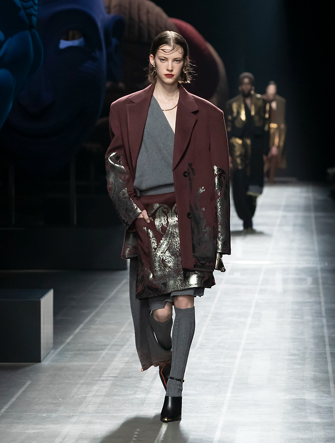 JW앤더슨은 마치 아빠옷을 입은듯한 파워 숄더에 버금가는 넓은 어깨, 일자로 툭 떨어지는 투박한 실루엣의 빅 숄더의 매니시한 코트룩을 선보여 눈길을 끌었다.