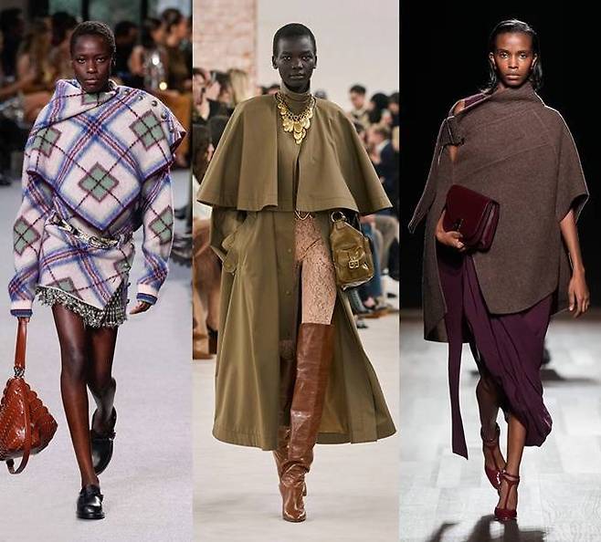 일명 ‘망토’라고 부르는 케이프는 비대칭 디자인 또는 너풀거리는 장식처럼 보이도록 깊이 절개한 새로운 형태의 다양한 형태로 변주한 케이프룩이 대거 등장했다.