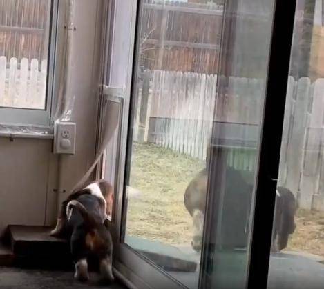 실내 공간의 출입문 앞, 두 마리의 닥스훈트가 서 있습니다. 앞에는 다소 특별한 구조의 문이 기다리고 있었죠. 문은 닫혀 있었지만, 그 아래엔 작은 개들이 통과할 수 있는 구멍이 있었고, 그 구멍엔 반투명한 칸막이가 부착되어 있었습니다. 어미 강아지는 아무렇지 않게 그 칸막이를 밀치며 문을 통과해 밖으로 나섭니다. 작은 몸짓 하나에 찰칵 소리도 없이 열리는 통로. 그런데 뒤따르던 새끼 강아지는 그 순간 멈춰 섭니다.