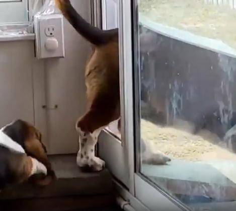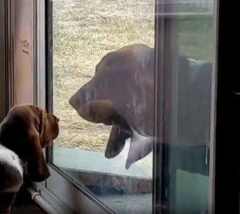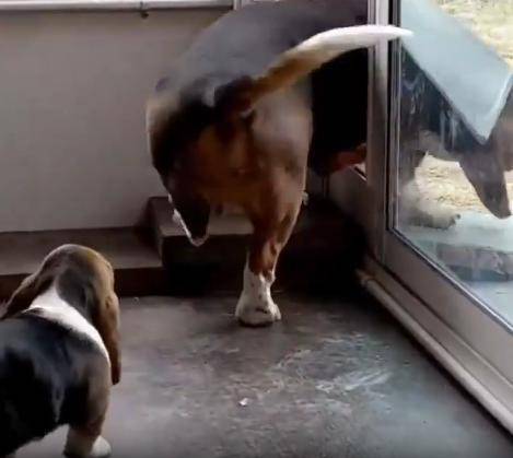 눈앞의 칸막이가 다시 제자리로 돌아오며 닫히는 걸 본 새끼는, 그게 진짜 문인 줄 착각한 듯합니다. 고개를 갸웃하더니 이내 문 옆의 창문을 통해 어미를 바라봅니다. 마치 “왜 나를 두고 가?”라고 묻는 듯한 눈빛이었어요. 창문을 사이에 둔 두 강아지의 시선이 잠시 교차되는 그 순간, 보는 이로 하여금 마음이 찡해지는 감정이 퍼져나옵니다. 고작 몇 초의 망설임이었지만, 새끼는 혼자 남겨진 듯한 막막함에 잠시 멈춰 섰던 거죠.