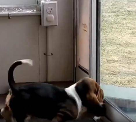 눈앞의 칸막이가 다시 제자리로 돌아오며 닫히는 걸 본 새끼는, 그게 진짜 문인 줄 착각한 듯합니다. 고개를 갸웃하더니 이내 문 옆의 창문을 통해 어미를 바라봅니다. 마치 “왜 나를 두고 가?”라고 묻는 듯한 눈빛이었어요. 창문을 사이에 둔 두 강아지의 시선이 잠시 교차되는 그 순간, 보는 이로 하여금 마음이 찡해지는 감정이 퍼져나옵니다. 고작 몇 초의 망설임이었지만, 새끼는 혼자 남겨진 듯한 막막함에 잠시 멈춰 섰던 거죠.