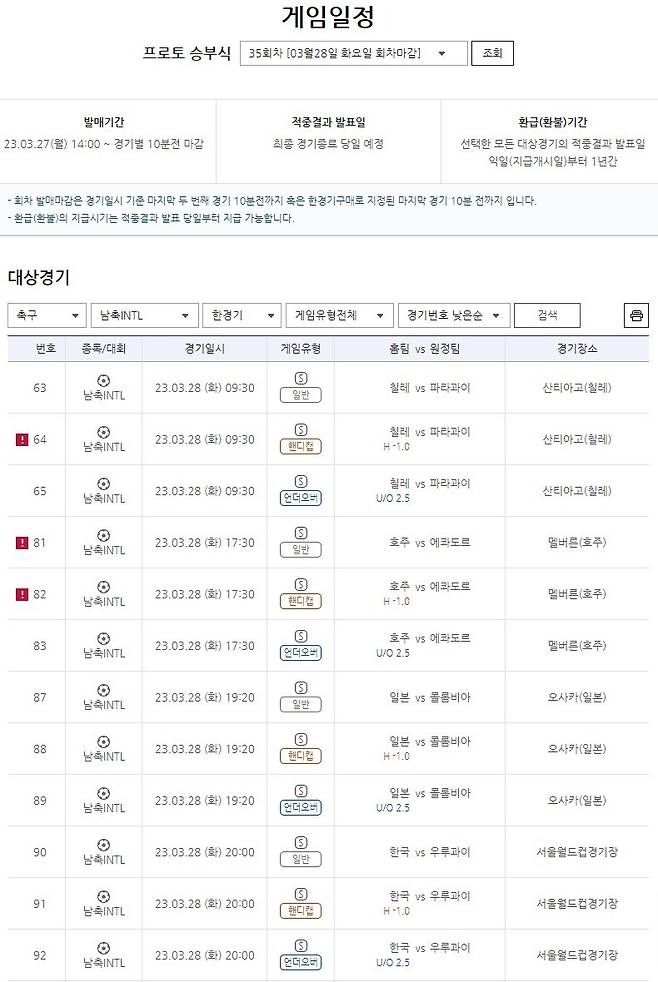 한편 프로토 승부식 35회차 중 대한민국-우루과이전을 대상으로 하는 한경기구매 게임은 ▲90번(일반) ▲91번(핸디캡) ▲92번(언더오버)의 각기 다른 세 가지 방식으로 게임 참여가 가능하다. 더불어 전반전 및 최종 점수를 맞히는 축구토토 매치 2회차, 최종 점수를 맞히는 게임인 프로토 기록식 26회차(E게임)도 같은 경기를 대상으로 발매가 개시됐으며 두 게임 모두 28일(화) 오후 7시 50분까지 구매가 가능하다.