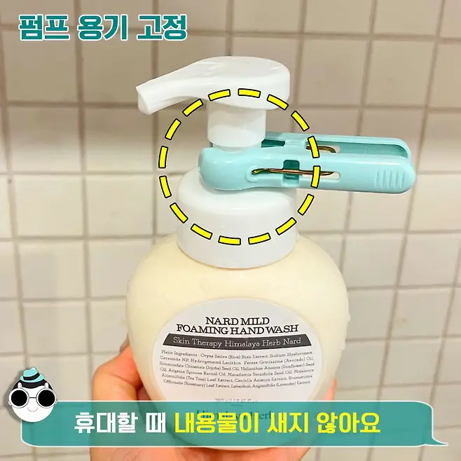 때문에 요런 펌프형 화장품을 휴대할 때 내용물이 샐 염려가 있어요. 그럴 때 펌프형 용기 고정핀 대신 빨래집게를 활용할 수 있다는 사실! 펌프 막대에 빨래 집게를 딱! 집어 고정해주면 가방에 넣어도 눌릴 염려 1도 없어요.