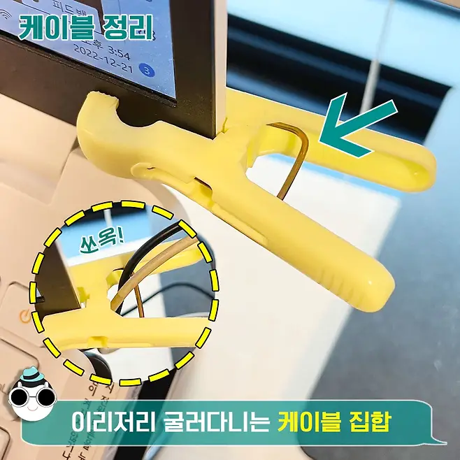 이제 집게의 손잡이 부분을 연결하는 철사(?) 같은 곳 보이죠? 거기로 케이블을 쏙 넣어주세요. 이리저리 놓여있던 케이블이 한 곳에 정리되며 책상이 훨씬 깔끔해 보일거에요ㅇ_ㅇ