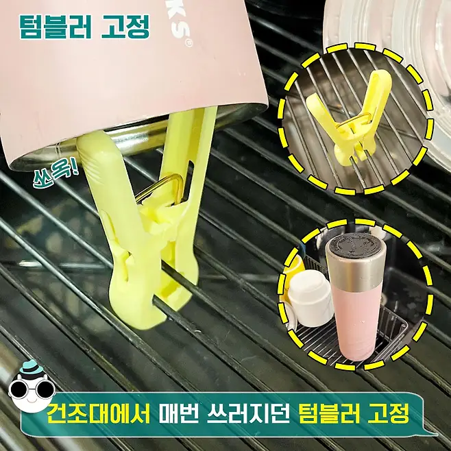그럴 때 빨래집게를 사용하면 쓰러지지 않고 쉽게 건조가 가능해요. 식기 건조대 망 부분에 빨래집게를 꽂아주세요. 그 후 텀블러를 뒤집어 빨래 집게 안에 쏙 넣으면 고정 완료.