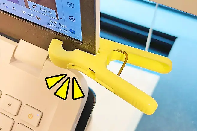 빨래 집게로 케이블까지 완벽 정리 할 수 있어요. 집게나 모니터 가장자리에 빨래 집게를 집어주세요. 이 때 스크린까지 같이 집어버리면 화면이 망가질 수 있어요. 그러니까 옆 테두리 부분만 살짝~