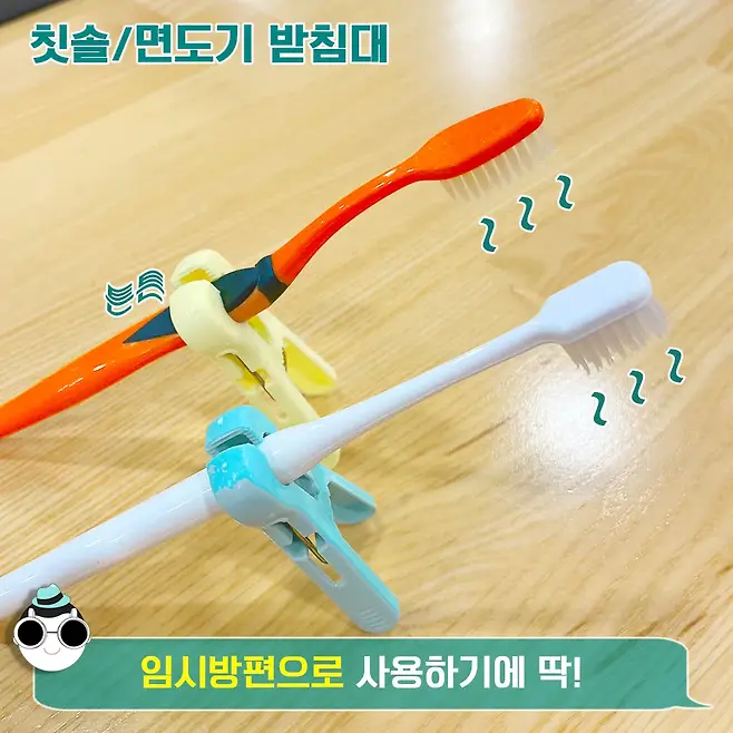그럴 때 빨래 집게로 칫솔과 면도기를 딱! 집어주세요. 임시 칫솔/면도기 받침대가 탄생한답니다~ 요렇게 바닥을 향해 세워두면 면도기와 칫솔에 묻은 물기가 잘 마르고, 솔과 날 부분이 바닥에 닿지 않아 깨끗해요@@